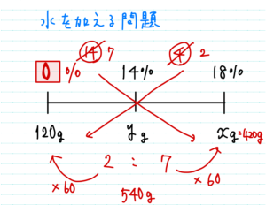 計算して、18%の食塩水は420グラム、出来た食塩水は540グラムとわかります。