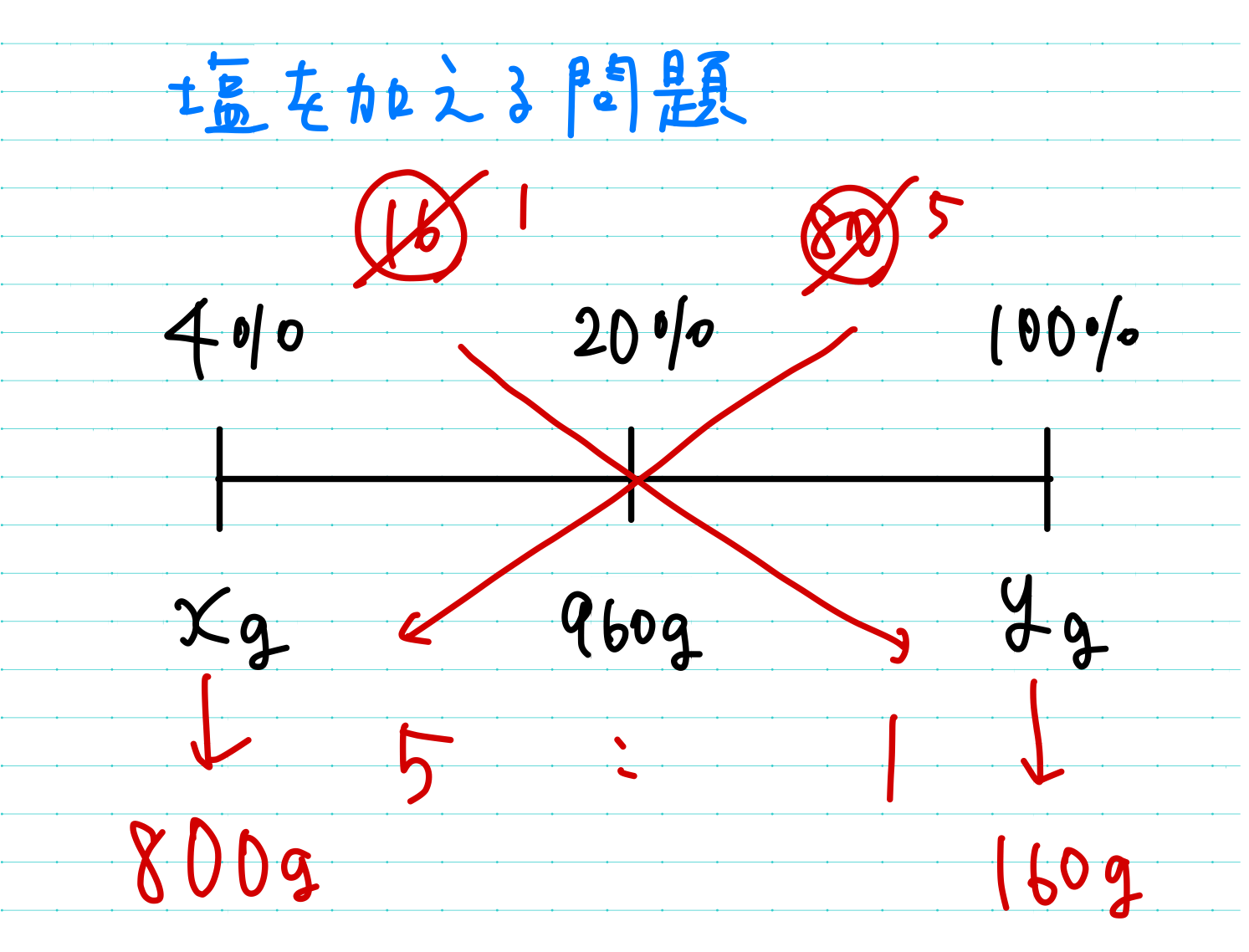 4%の食塩水に塩を加えて、20%の食塩水を960グラム作る。4%の食塩水は何グラム?塩は何グラム?