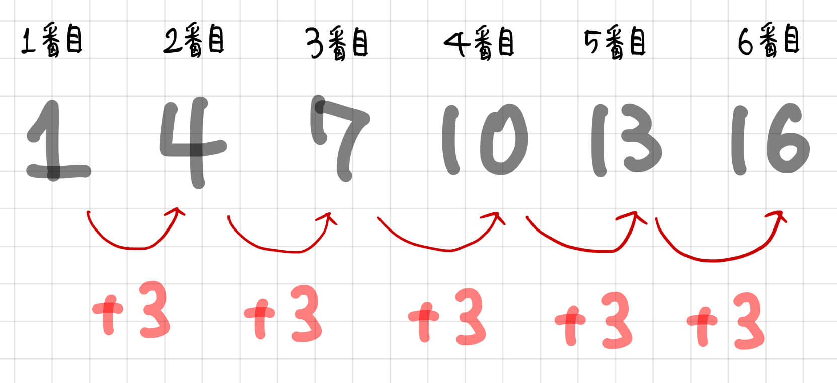 と、その前に次の問題をみてください。 [aside type=”boader”]数字が一定の間隔で並んでいます。28番目の数字はいくつでしょう。1, 4, 7, 10, 13, 16・・・