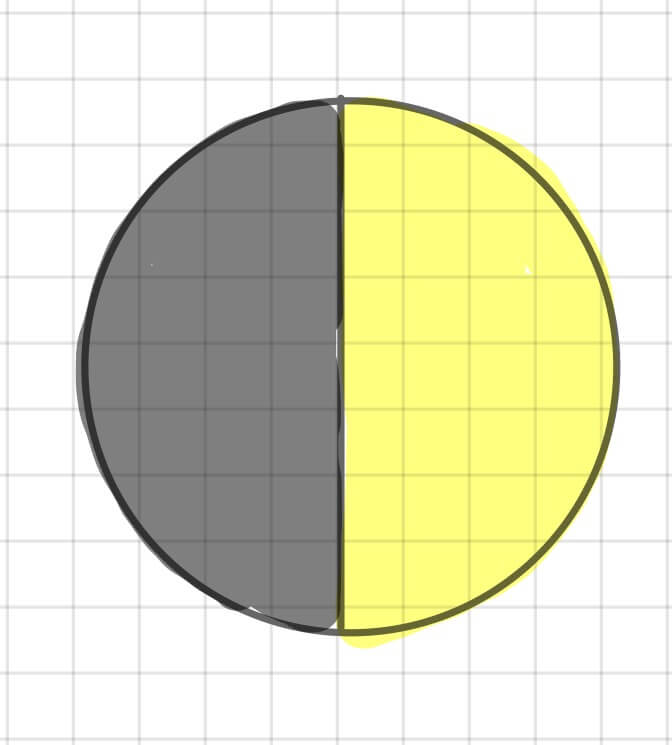 Aの位置に地球があるとき、右から太陽の光があたっているので、右半分を黄色で塗りました。